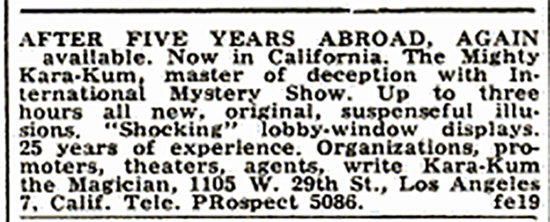 The Mighty Kara-Kum — a Polish magician in Los Angeles who claimed to be a survivor of the 1939 Seige of Warsaw and said he last saw his parents in the Dachau concentration camp