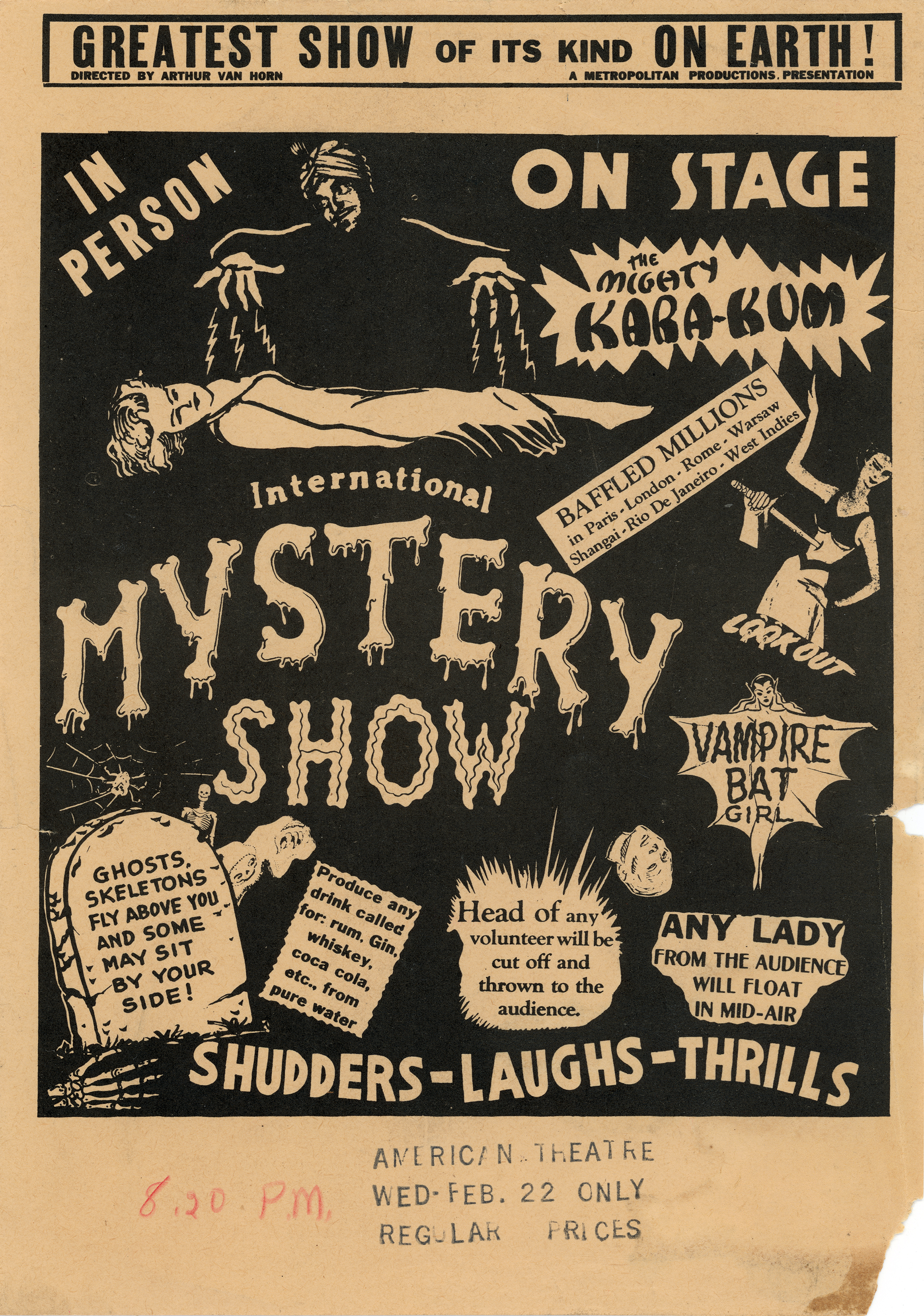 — brought his show to the stage at the American Theatre in Newhall on February 22, 1956, with promises of levetating female audience members and beheading volunteers.