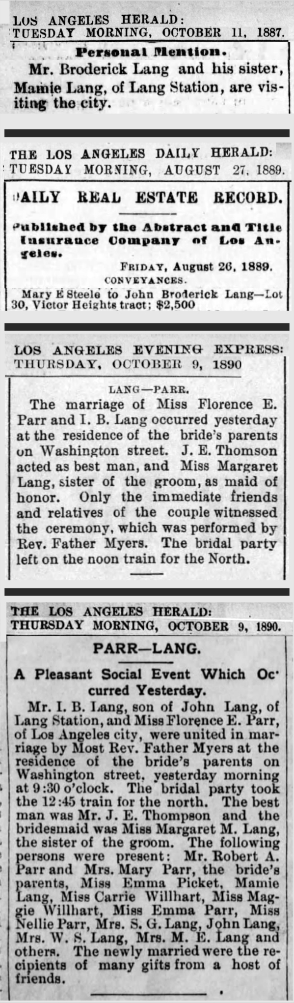 • Elizabeth Florence Parr, (future) daughter-in-law. Born in Ontario, Canada, November 15, 1867. Married at her family home in Los Angeles to John Broderick Lang, October 7, 1890. Died August 10, 1931, in Simi Valley.