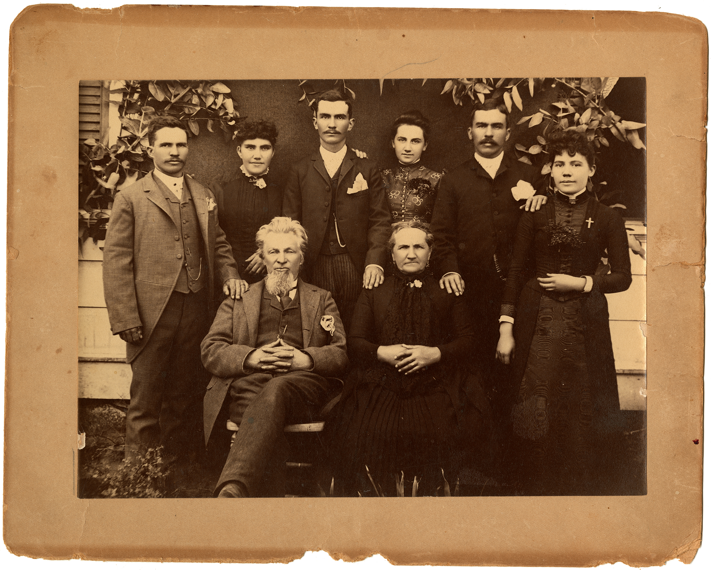 Original portrait of John and Mary Lang and their five surviving children and future daughter-in-law, circa 1889. Silver albumen print, 8⅛x6 inches mounted on pressed-paper board (cabinet card stock),