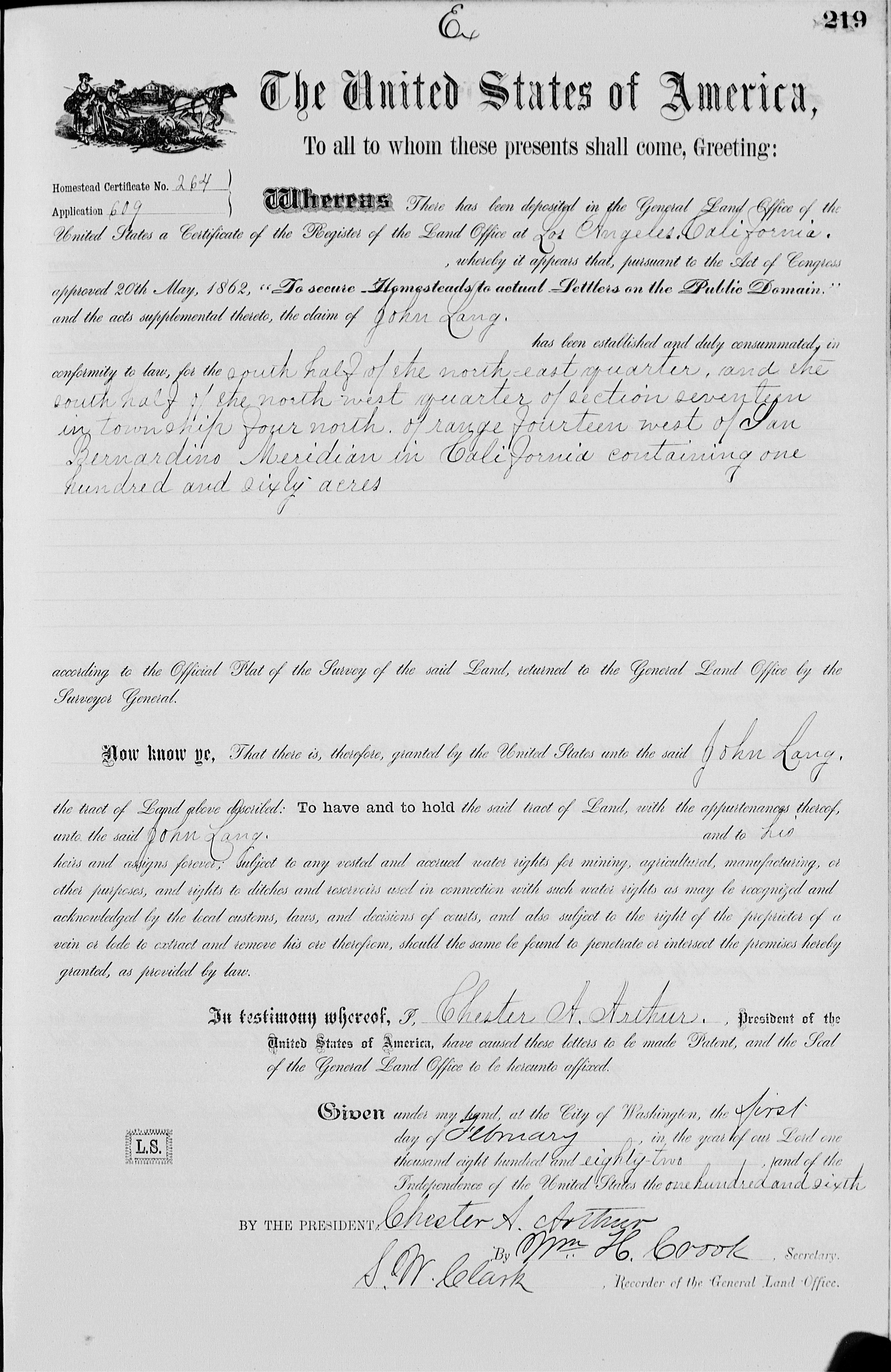 Southern Pacific Railroad right-of-way (see map below). His first land patent was issued February 1, 1882, and his second on July 18, 1898. (Note that this is not when he filed for the homesteads; it is when he