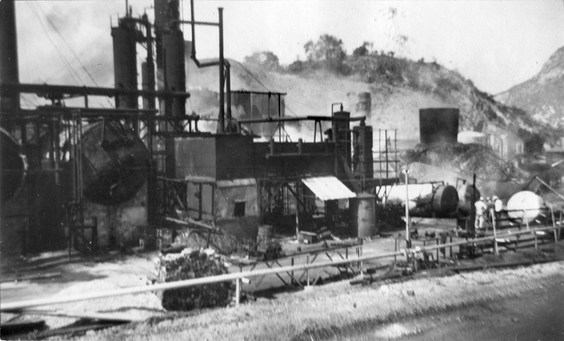 Newhall Refinery, probably 1944. The men in the middle of the image are looking at something that has exploded (which was not terribly uncommon), and the white tank has fallen over.
