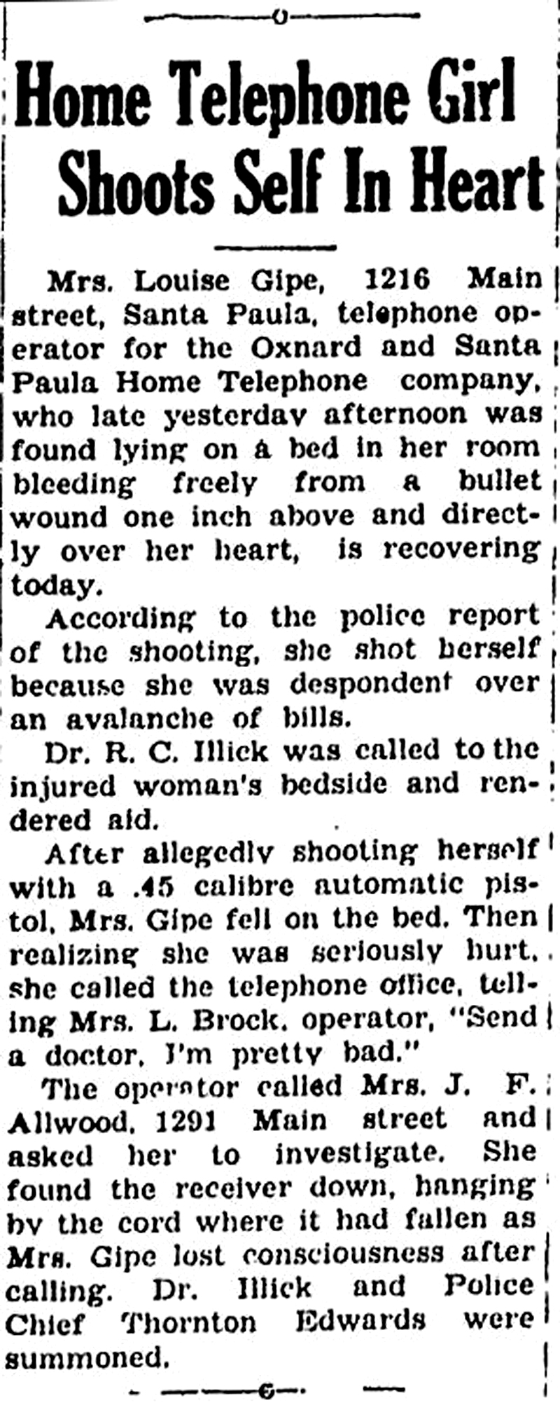 Mrs. Louise Gipe, 1216 Main Street, Santa Paula, telephone operator for the Oxnard and Santa Paula Home Telephone company, who late yesterday afternoon was found lying on a bed in her room bleeding freely from a bullet wound one inch above and directly over her heart, is recovering today.