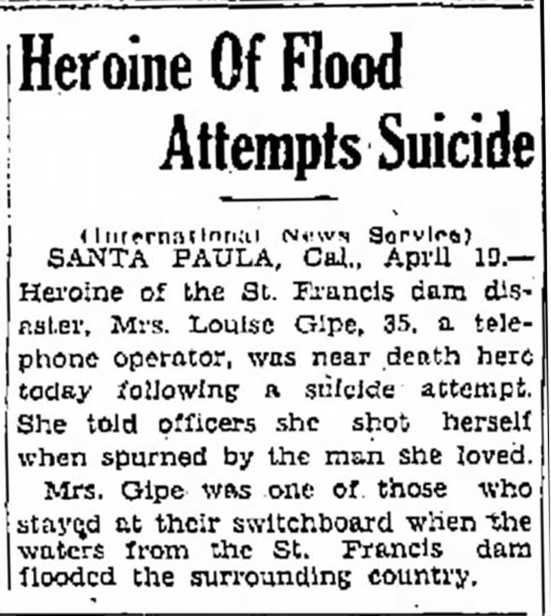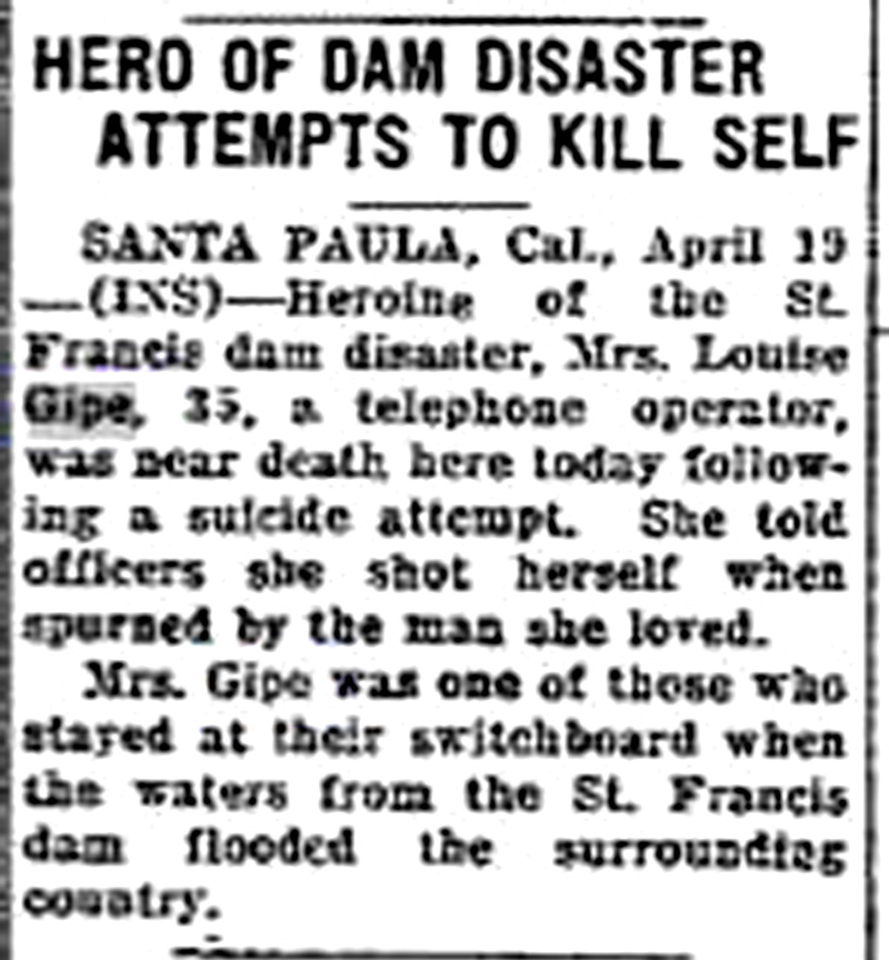 Santa Paula, Cal., April 19. — Heroine of the St. Francis dam disaster, Mrs. Louise Gipe, 35, a telephone operator, was near death here today following a suicide attempt. She told officers she shot herself when spurned by the man she loved.