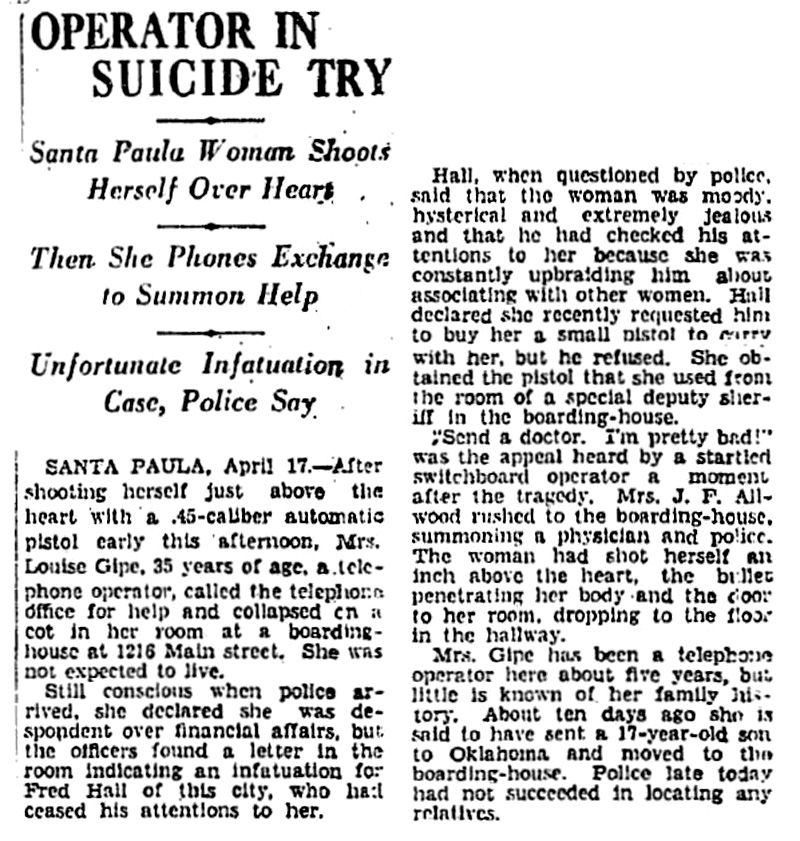 Santa Paula, April 17. — After shooting herself just above the heart with a .45-caliber automatic pistol early this afternoon, Mrs. Louise Gipe, 35 years of age, a telephone operator, called the telephone office for help and collapsed on a cot in her room at a boarding-house at 1216 Main street. She was not expected to live.