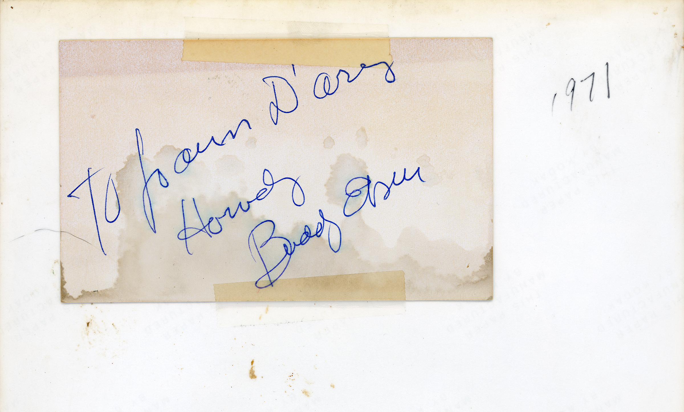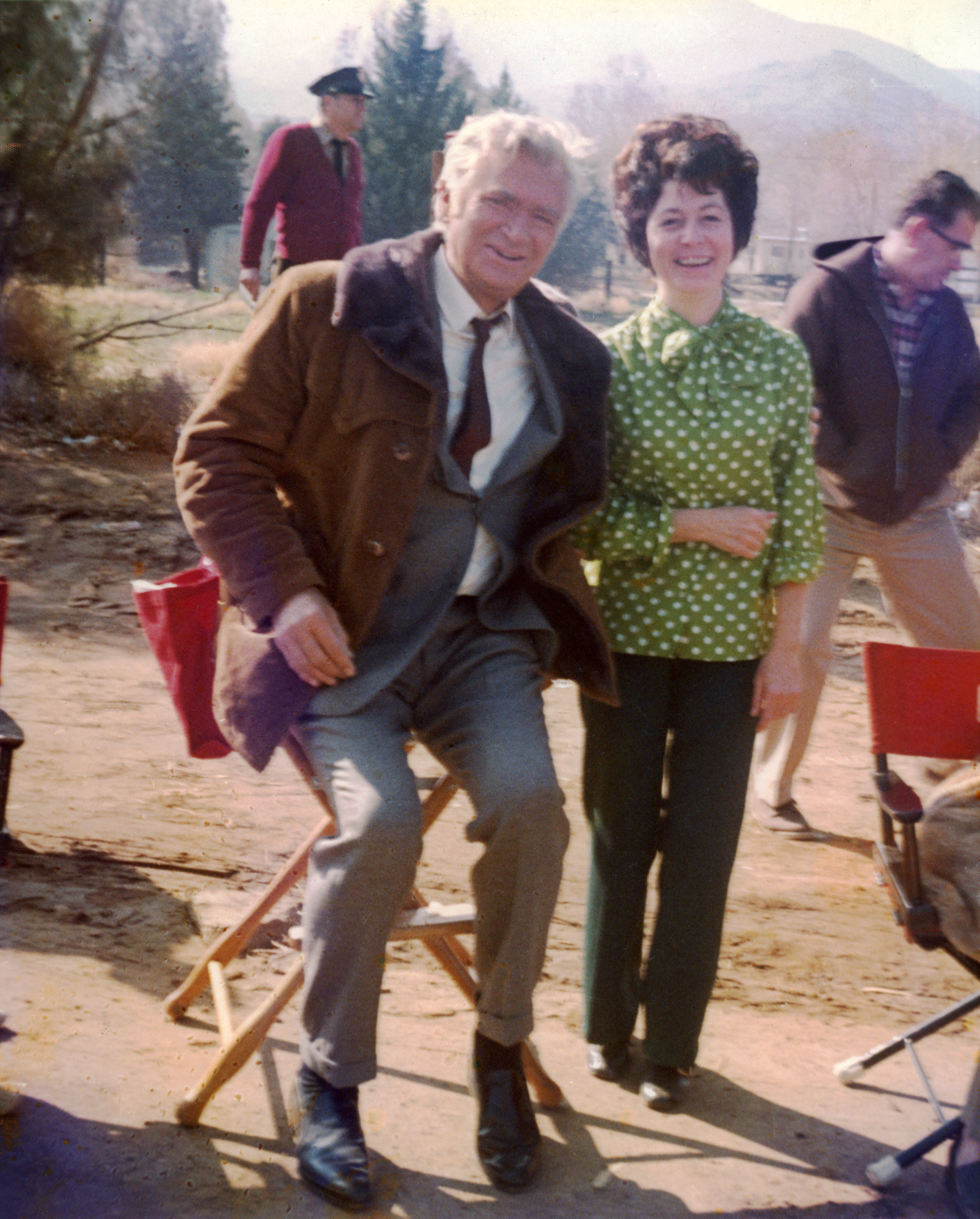 Jo Anne Darcy with actor Buddy Ebsen in 1971. Appears to be a film location shoot, probably on the west side of Crown Valley Road in Acton — but we don't know that; no written information accompanies this 8x10 matte print other than a personalized autograph from Ebsen taped to the back, and the year (below). At the time, Jo Anne and husband Curtis Darcy owned and operated Acton's '49er Saloon (1968-1974). The ninth and final season of the Ebsen vehicle, "The Beverly Hillbillies," had already wrapped production by this time. There are a couple of distinct possiblities: "Gunsmoke" Season 17 Episode 11 ("Drago"), which aired November 22, 1971, on CBS; or "Bonanza" Season 13 Episode 17 ("The Saddle Stiff"), which aired January 16, 1972, on NBC. The Darcys would leave Acton and move to the Emblem tract in Saugus. Jo Anne (1931-2017) managed the Newhall-Saugus-Valencia (later SCV) Chamber of Commerce, then served as senior field deputy to Supervisor Michael D. Antonovich and co-founded the Newhall Walk of Western Stars in 1981. She went on to serve as a founding City Council member and 4-time mayor of the City of Santa Clarita. Ebsen (1908-2003) never made it into the Walk.