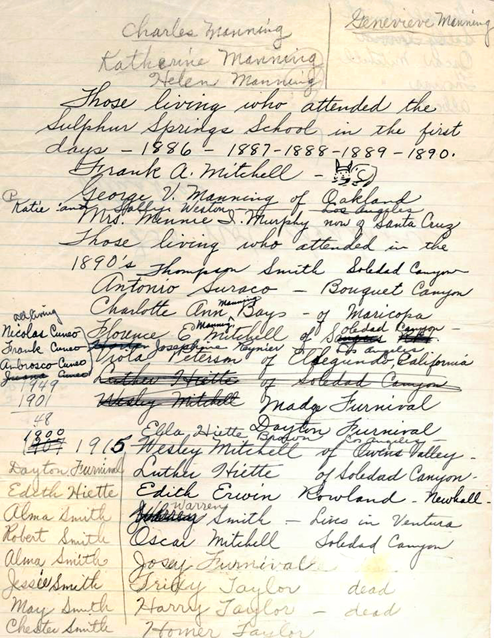 According to contributor Janet Vining Mitchell, the list was probably compiled in 1949, maybe for a reunion, by Florence Manning Mitchell, daughter-in-law of Soledad Canyon homesteaders Thomas F. and Martha Mitchell. Florence's husband, Frank A. Mitchell, is listed among the living; he died in 1950.