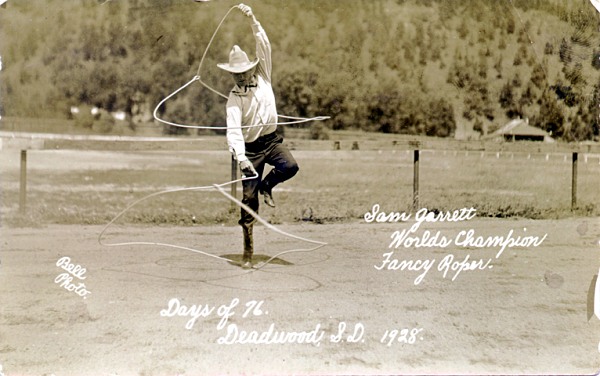 Postcard of Sam Garrett, world's champion fancy roper at Deadwood, S.D., 1928.