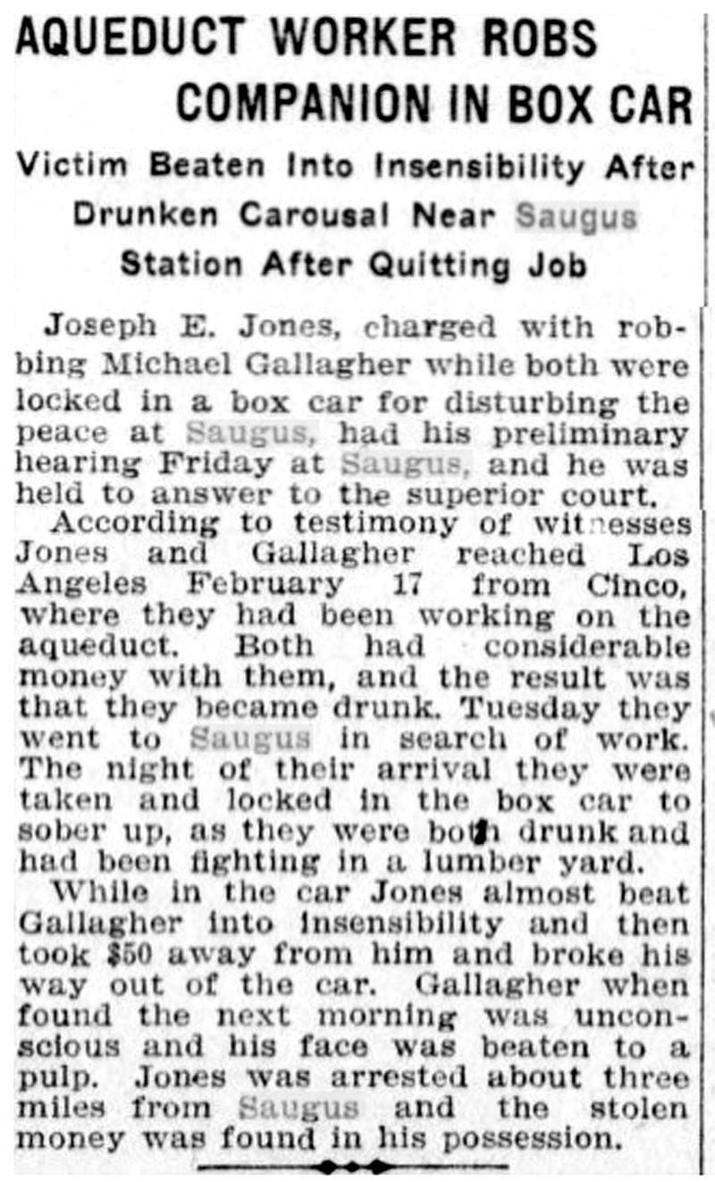 According to testimony of witnesses, Jones and Gallagher reached Los Angeles February 17 from Cinco, where they had been working on the aqueduct. Both had considerable money with them, and the result was that they became drunk. Tuesday they went to Saugus in search of work. The night of their arrival they were taken and locked in the box car to sober up, as they were both drunk and had been fighting in a lumber yard.