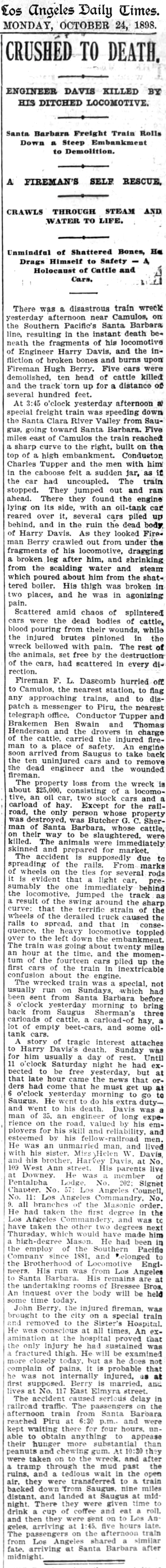 At 3:45 o'clock yesterday afternoon a special freight train was speeding down the Santa Clara River Valley from Saugus, going toward Santa Barbara. Five miles east of Camulos the train reached a sharp curve to the right, built on the top of a high embankment. Conductor Charles Tupper and the men with him in the caboose felt a sudden jar, as if the car had uncoupled. The train stopped. They jumped out and ran ahead. There they found the engine lying on its side, with an oil-tank car reared over it, several cars piled up behind, and in the ruin the dead body of Harry Davis. As they looked Fireman Berry crawled out from under the fragments of his locomotive, dragging a broken leg after him, and shrinking from the scalding water and steam which poured about him from the shattered boiler. His thigh was broken in two places, and he was in agonizing pain.