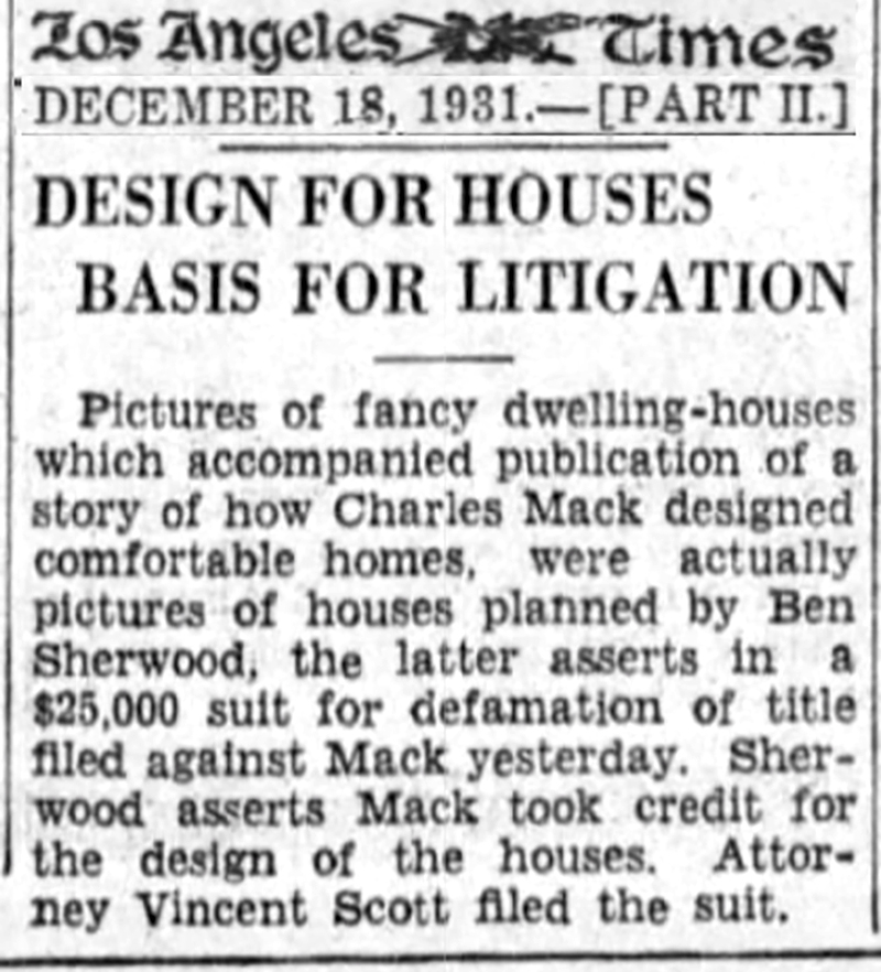 The architect claimed Mack denied Sherwood was the designer and caused to be published in newspapers pictures of the houses accompanied by articles claiming Mack was the architect. Sherwood claimed he had lost considerable business.