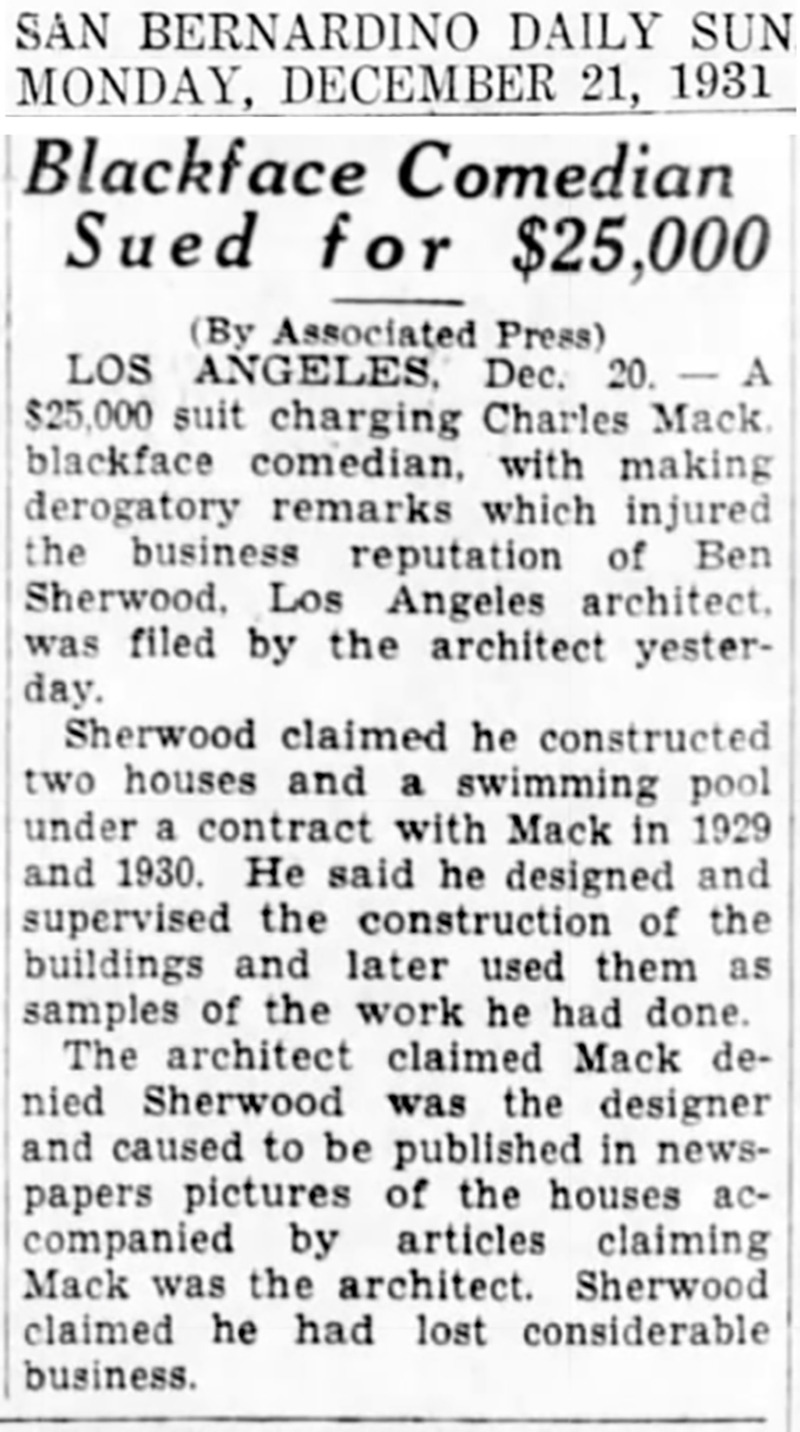 Los Angeles, Dec. 20. — A $25,000 suit charging Charles Mack, blackface comedian, with making derogatory remarks which injured the business reputation of Ben Sherwood, Los Angeles architect, was filed by the architect yesterday.