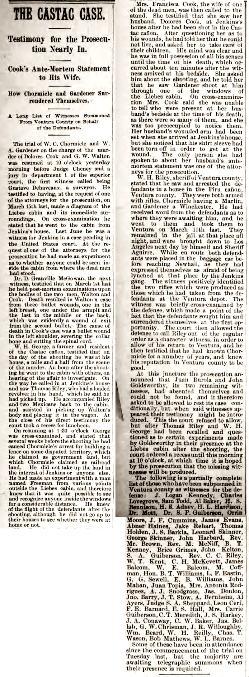 The trial of W.C. Chormicle and W.A. Gardener on the charge of the murder of Dolores Cook and G.W. Walton was resumed at 10 o'clock yesterday morning before Judge Cheney and a jury in department 1 of the superior court, the first witness called being Gustave Dehaveaux, a surveyor. He testified to having, at the request of one of the attorneys for the prosecution, on March 15th last, made a diagram of the Liebes cabin and its immediate surroundings. On cross-examination he stated that he went to the cabin from Jenkins's house. Last June he was a witness for Jenkins in a case pending in the United States court. At the request of one of the attorneys for the prosecution he had made an experiment as to whether anyone could be seen inside the cabin from where the dead men had stood.