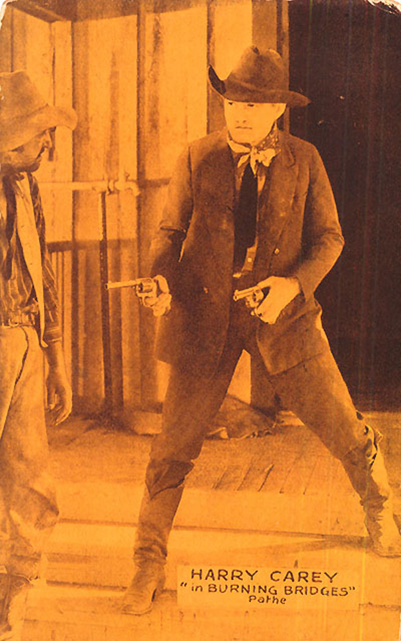 Arcade card of Harry Carey Sr. in "Burning Bridges," a 6-reeler released Sept. 30, 1928, by Pathé Exchange Inc.