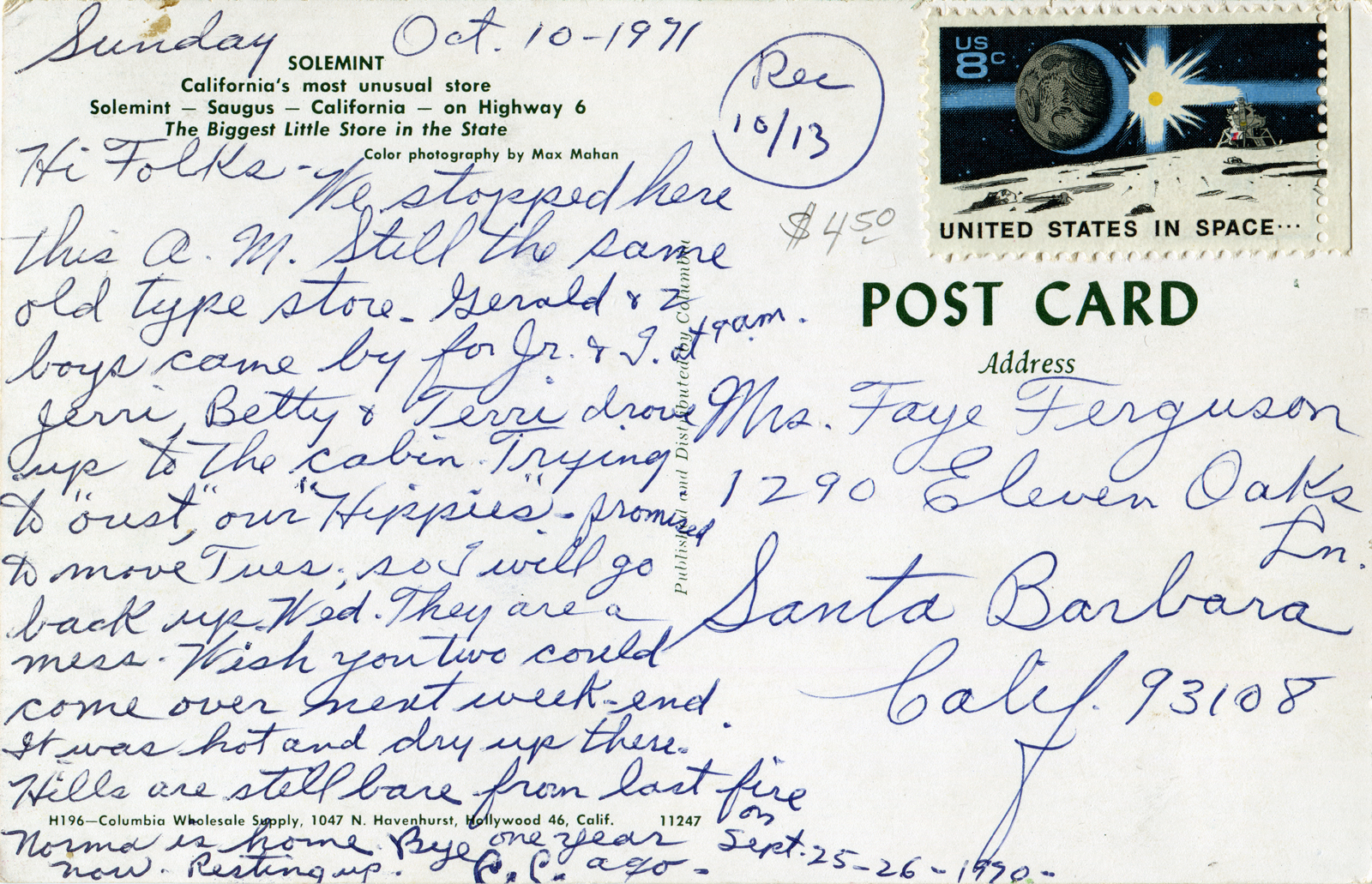 Mailed Oct. 10, 1971, to Mrs. Faye Ferguson of 1290 Eleven Oaks Lane in Santa Barbara. The personal note offers a little reminder of life in the early 1970s: