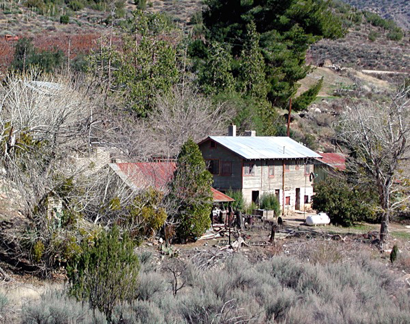 March 12, 2001: The Blum Ranch, est. 1891 in Aliso Canyon (Acton) by George and Magdalena Blum. The original rock-walled homestead house forms the base of the two-story wood frame structure. On either side are out-buildings. A peach orchard is visible at upper left.