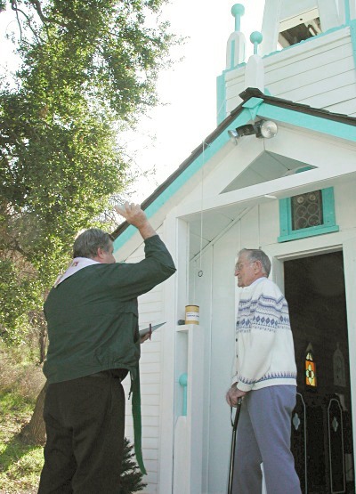 Dec. 9, 2001: Father Norm Supancheck from Our Lady of Perpetual Help Catholic Church in Newhall blesses the Ramona Chapel with holy water as restoration project leader Allan Howe looks on. | ||