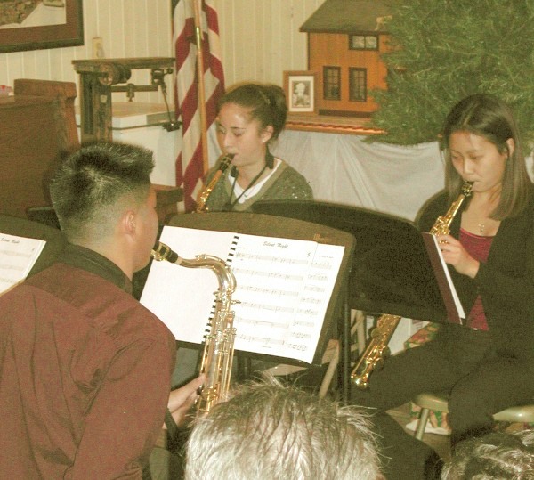 Dec. 9, 2001: A saxaphone quartet from William S. Hart High School (the baritone is out of view) performs at the SCV Historical Society's Christmas Open House, which was organized by Society Board Member Cathy Martin and coincided with the dedication of the Ramona Chapel.