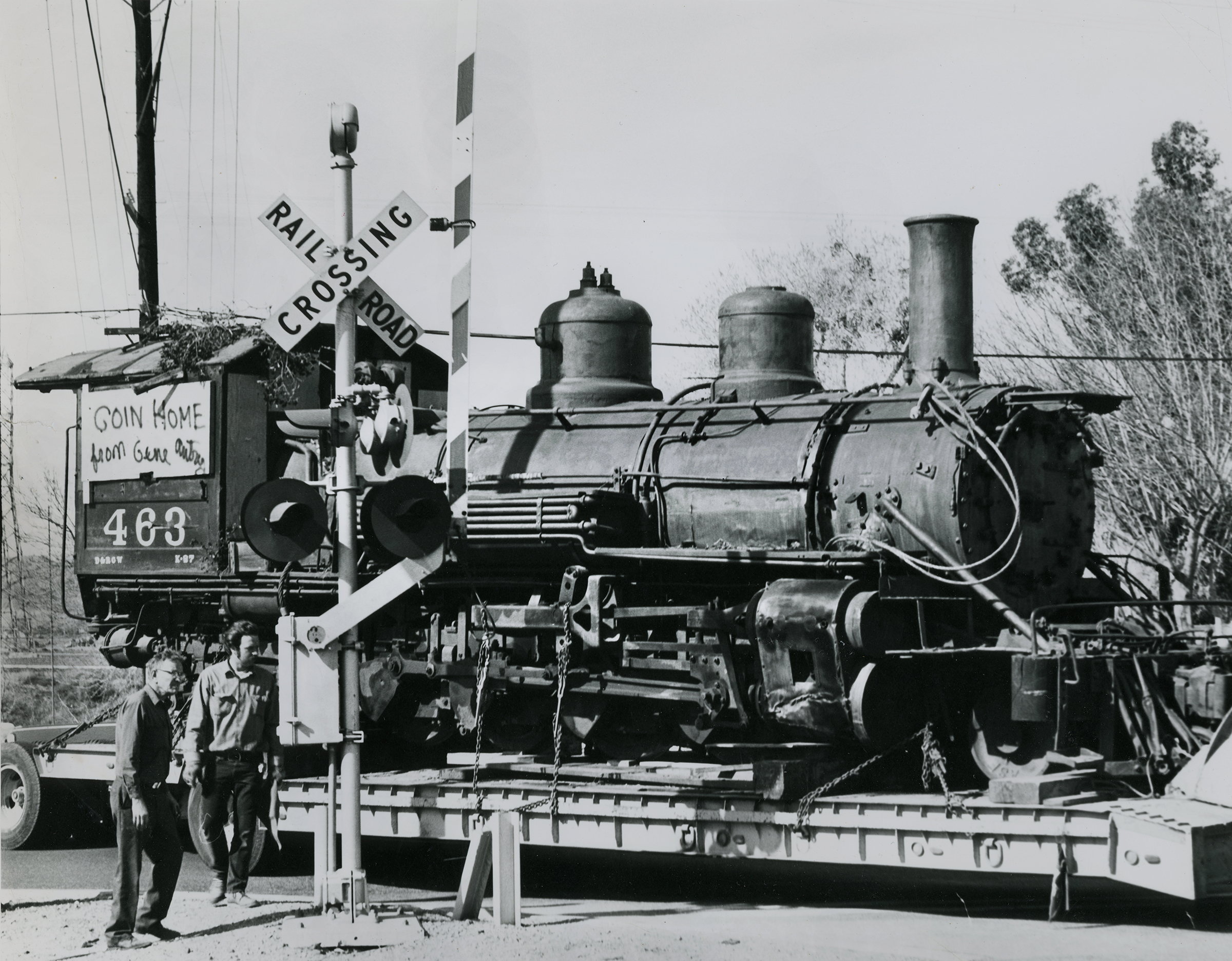 Gene Autry's Engine 463, which he acquired in 1955 and kept at Melody Ranch, is trucked through