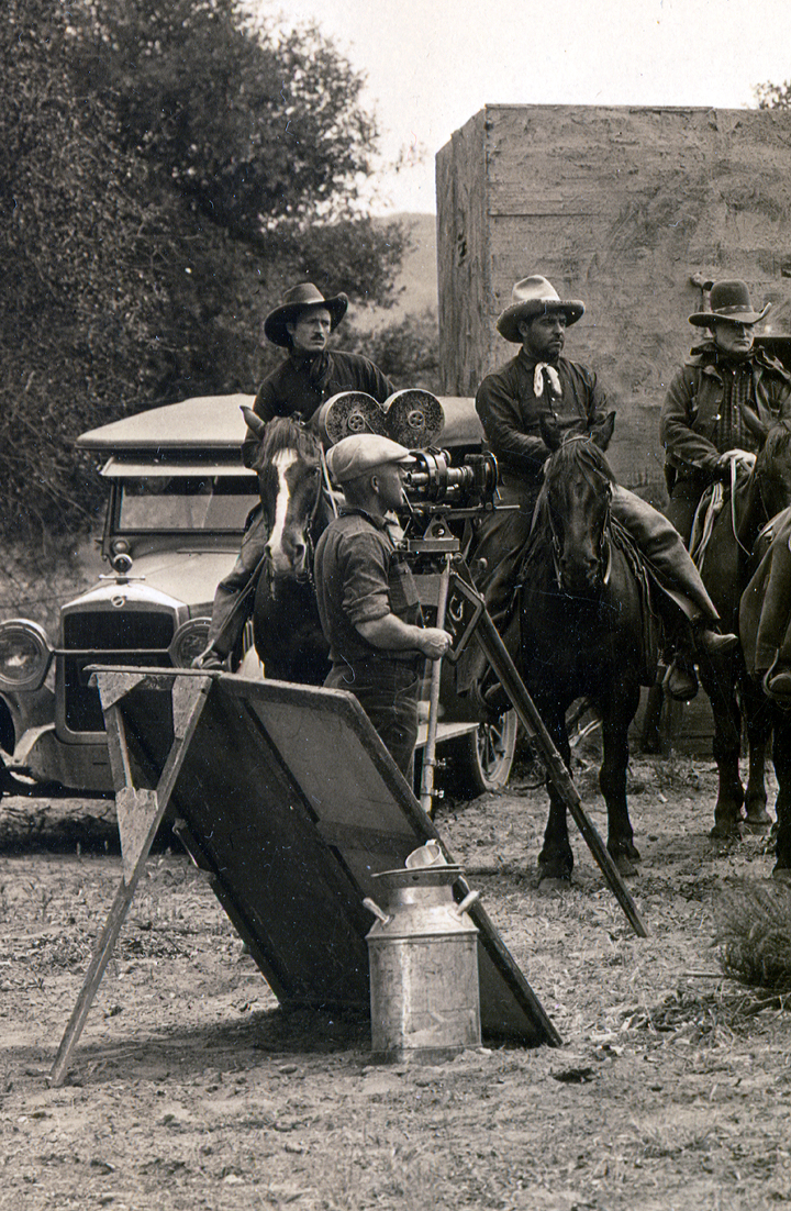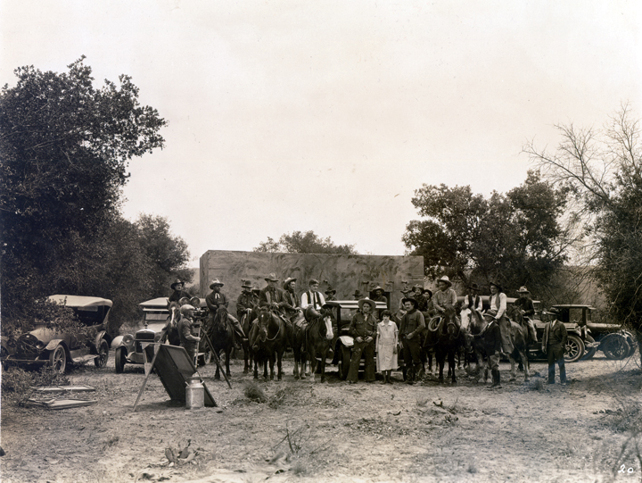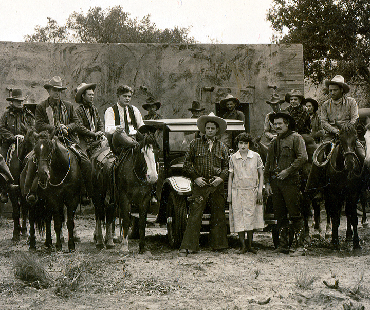 On a film set in Placerita Canyon, early 1930s. 8x10 photo from the collection of stutman Andy Jaregui of Newhall. | ||