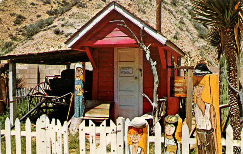 1960s postcard of the Little Red Schoolhouse and Ramona buggy at Callahan's Old West Trading Post.