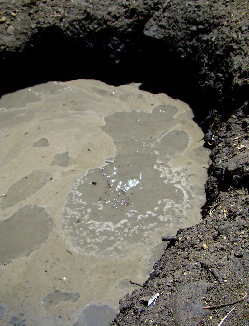 June 2, 2012: Placerita "white oil" bubbles up from the casing of New Century Oil Co. Well No. 1, underneath the present-day Canyon Trail at Placerita Canyon State and County Park. The trail runs between the Placerita Nature Center on the west and the Walker Ranch entrance on the east. The seep is closer to the Walker Ranch entrance than it is to the nature center.