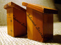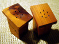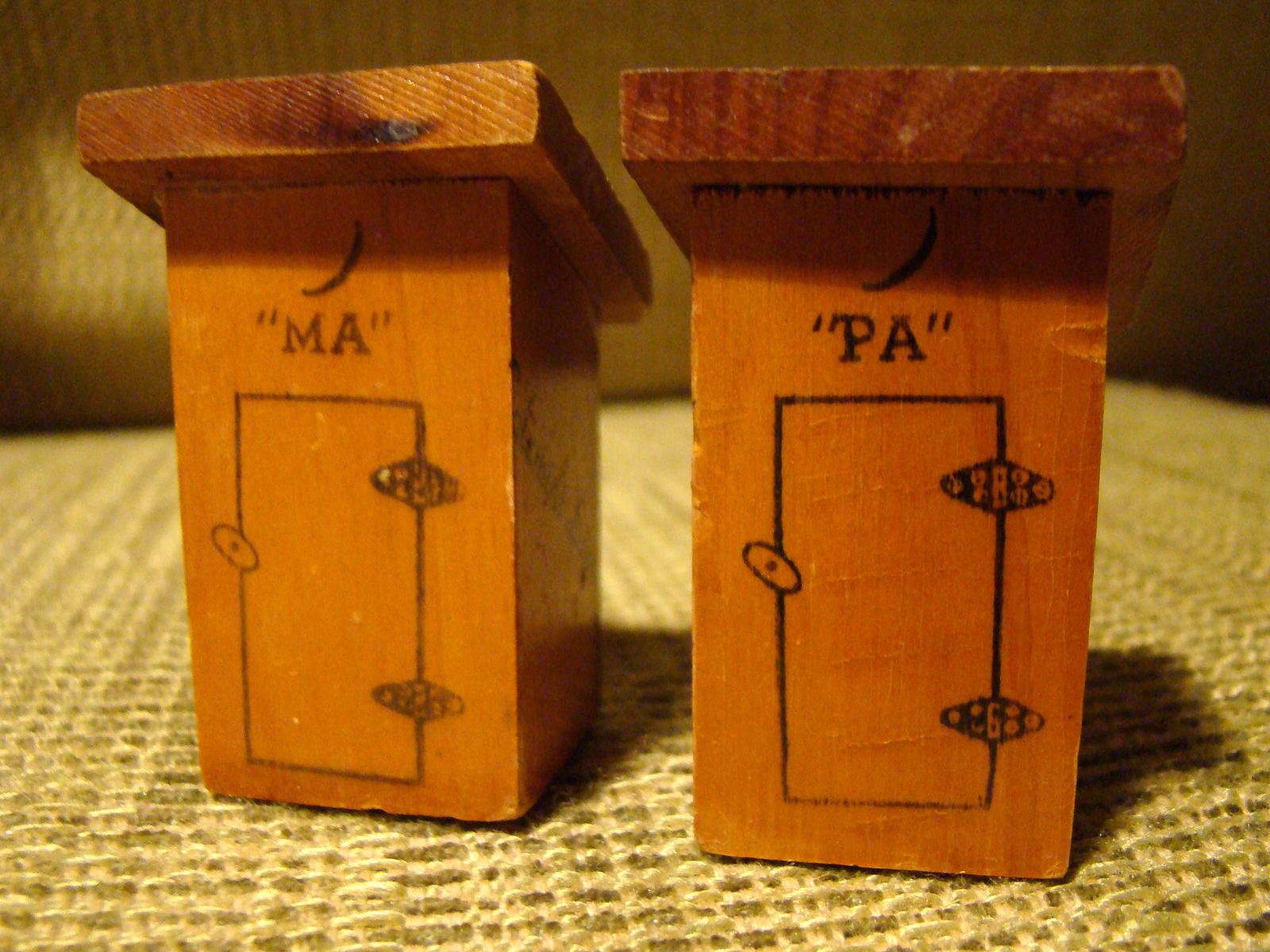 Ma and Pa's matching "outhouse" salt and pepper shakers (1 inch square, 2 inches at tallest point) from the Solemint Store, established in 1938 at Solemint Junction (the intersection of Sierra Highway and Soledad Canyon Road).