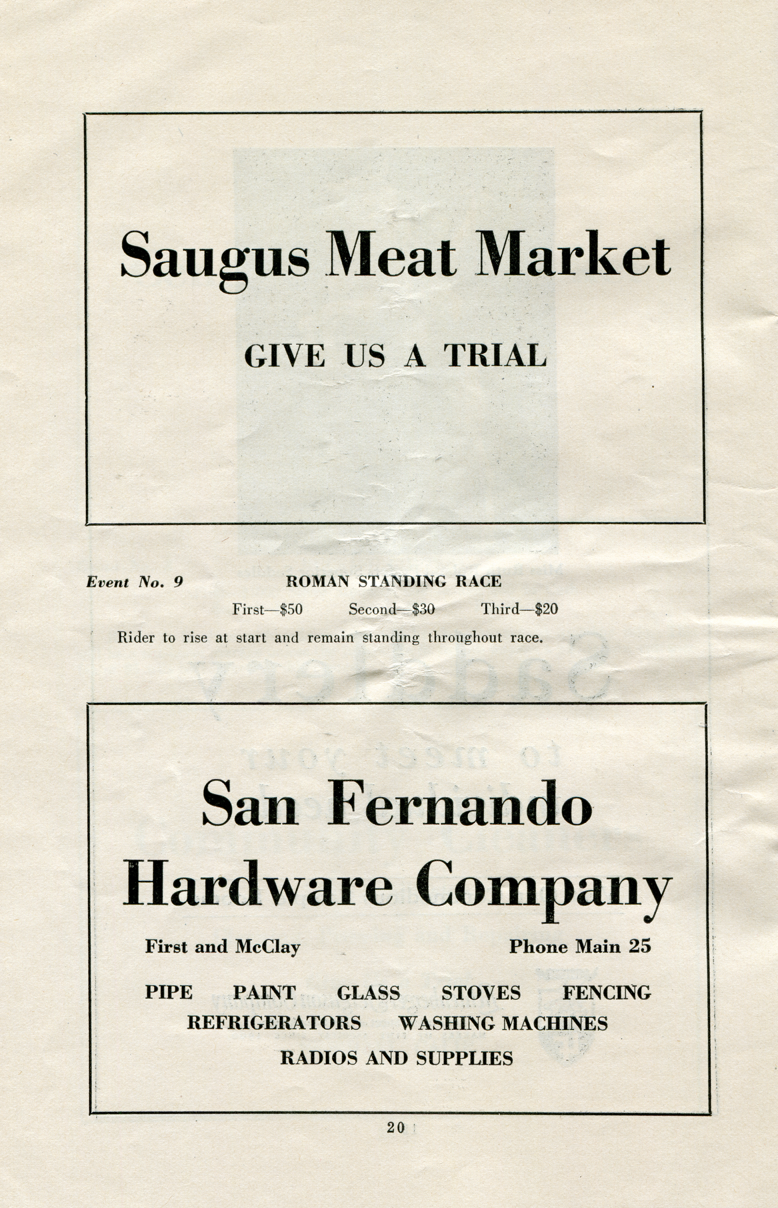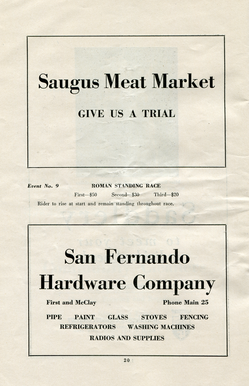 Advertisements for the Saugus Meat Market and San Fernando Hardware Co. at 110 N. Maclay (misspelled McClay). The big hardware store, which served both valleys, was founded in 1915 by Chicago native David Elam Lewis. He retired in the late 1930s and sold it to a