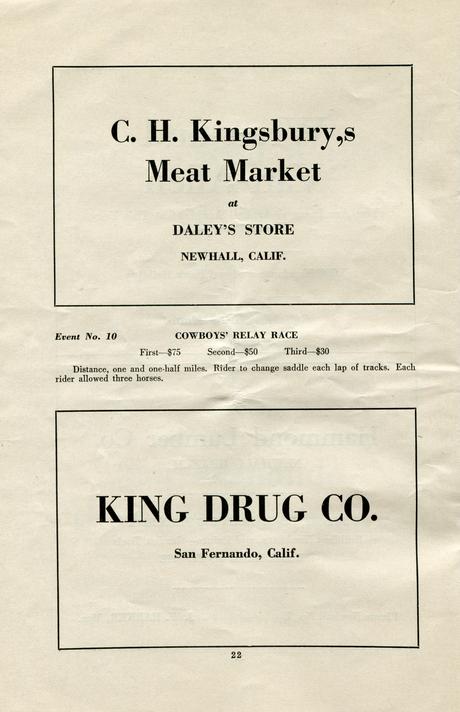 Advertisements for Charles Kingsburry's Meat Market in Newhall (inside Daley's grocery store) and King Drug Co. of San Fernando.
