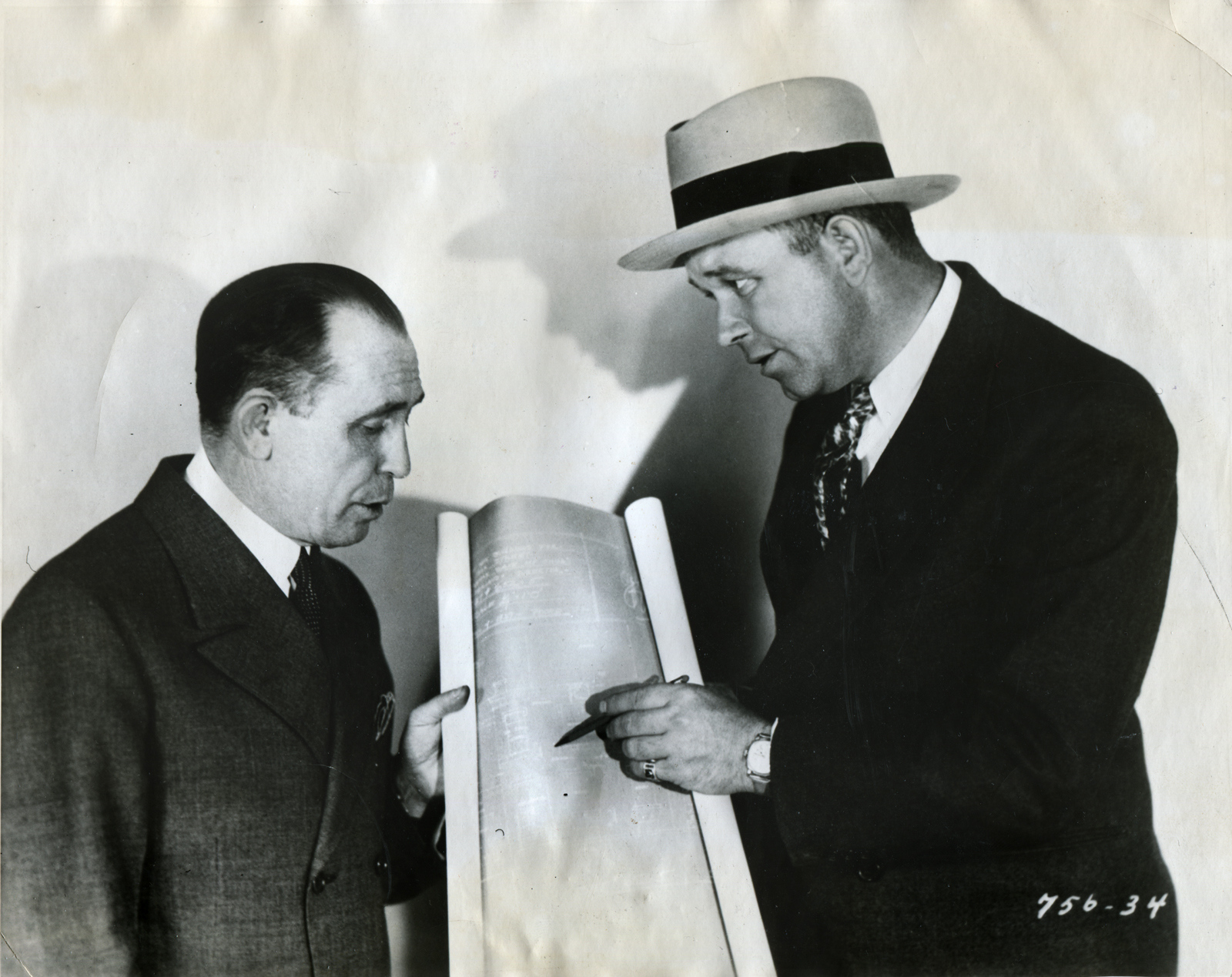 What they're actually doing in this photograph, which appears to be a studio production still that was repurposed as a wire photo, is not explained. It looks like they're holding some sort of construction blueprints.