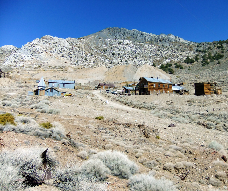April 21, 2013 — Overview of the Cerro Gordo mining camp, looking east from Beaudry's smelter (furnace). The metal-sided garage (now chapel) is at left and the 1871 American Hotel is at right.