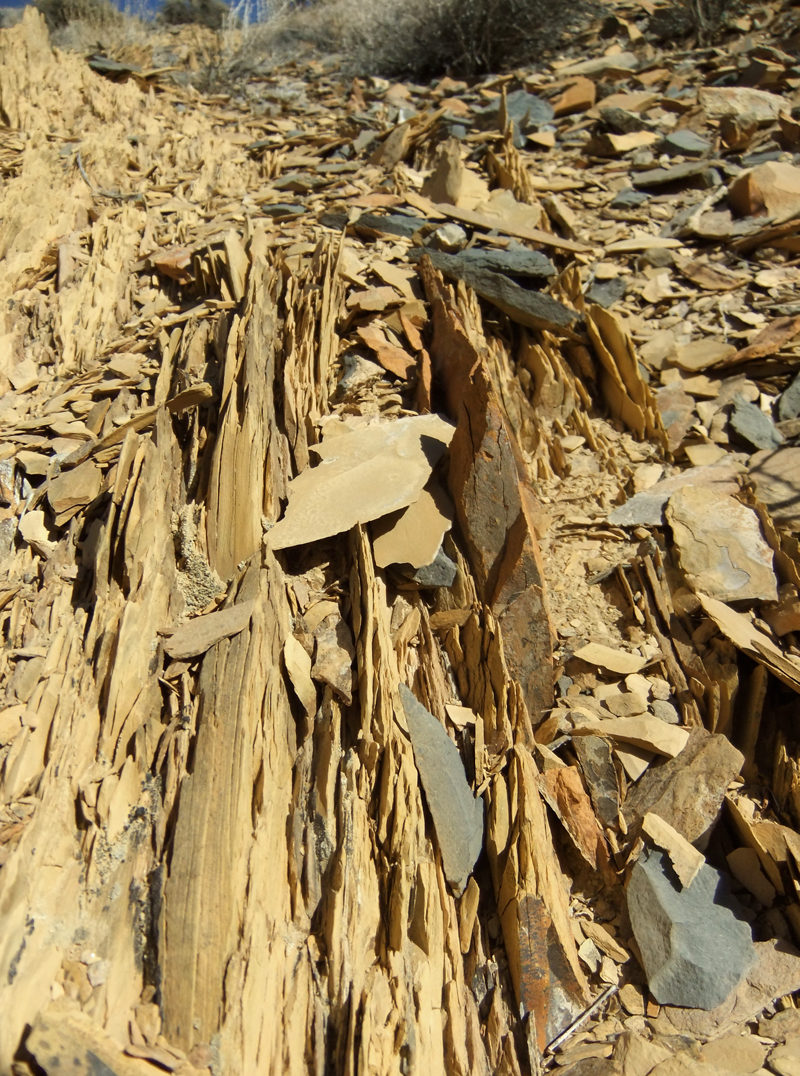 April 21, 2013 — Yellow shale, from which the Yellow Grade Road derives its name, approx. 6 miles up the road from Owens Lake (approx. 2 miles below the mining camp at the top of Buena Vista Peak).