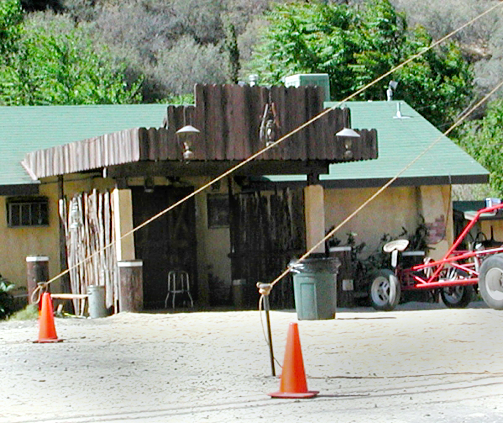 T3 premiered in Westwood on June 30, 2003. In this set of photos, shot almost exactly one year earlier — June 28, 2002 — the Sierra Inn is being transformed into the Desert Star. Set decoration included, most notably, the installation of a neon sign in front of the bar, near the roadway; and a crude, wood-sided and -roofed entryway that was attached to the front-middle of the stucco building.