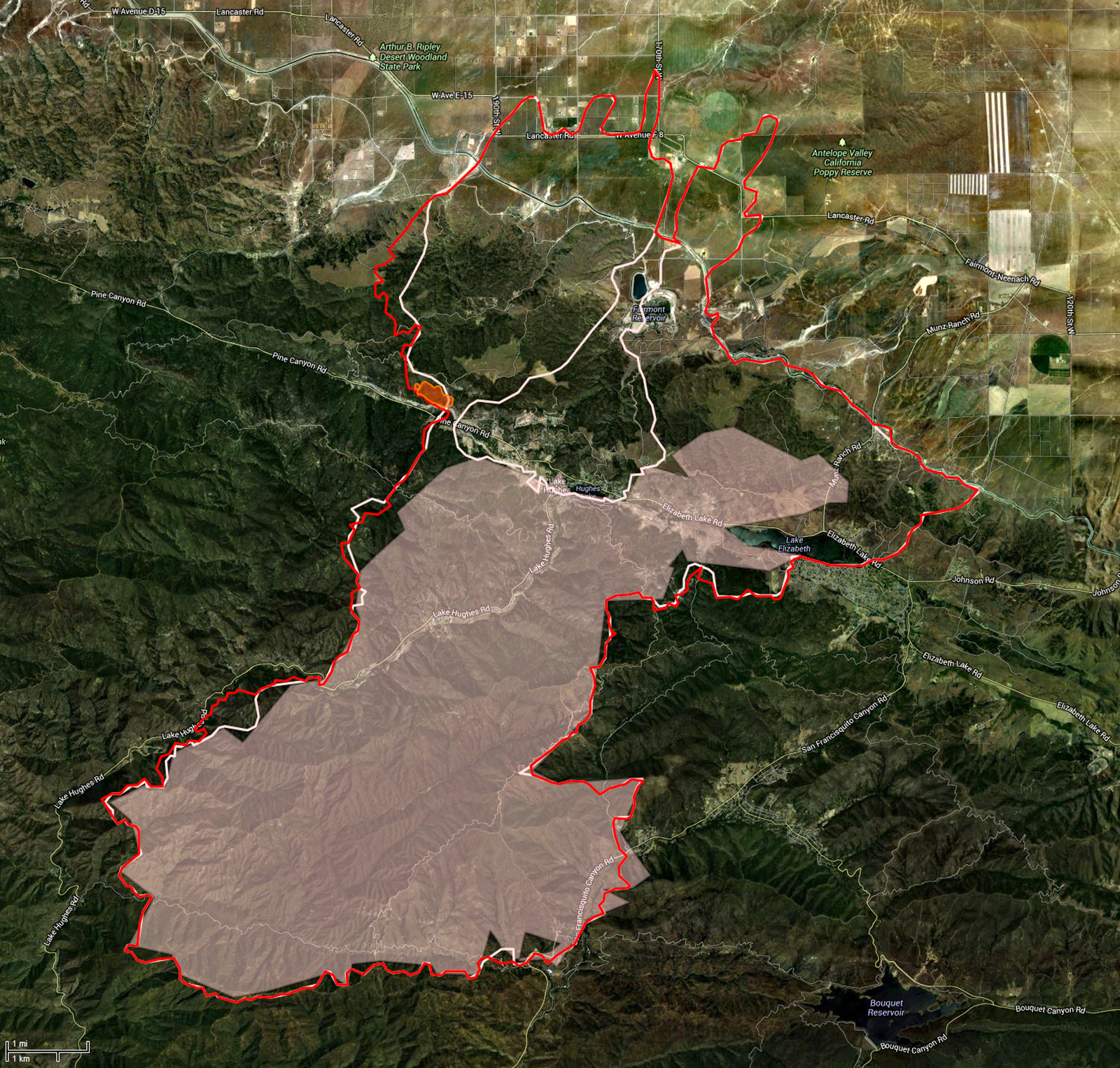 By evening the fire had consumed 1,000 acres and threatened Green Valley, whose residents were evacuated to a Red Cross center at Marie Kerr Park in Palmdale. Large animals went to the Antelope Valley Fairgrounds. Ultimately the fire didn't reach Green Valley; instead, the southern flank continued to burn near the power plant for days while the northern flank rushed toward Lake Hughes.
