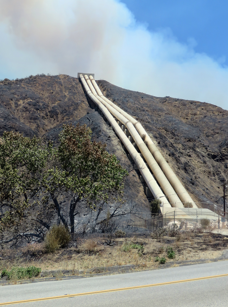 June 2, 2013 — The penstocks lead down to LADWP's Power House 1, near the point of origin in San Francisquito Canyon. (The pipes run under the road to the power plant, which is at the photographer's back.)