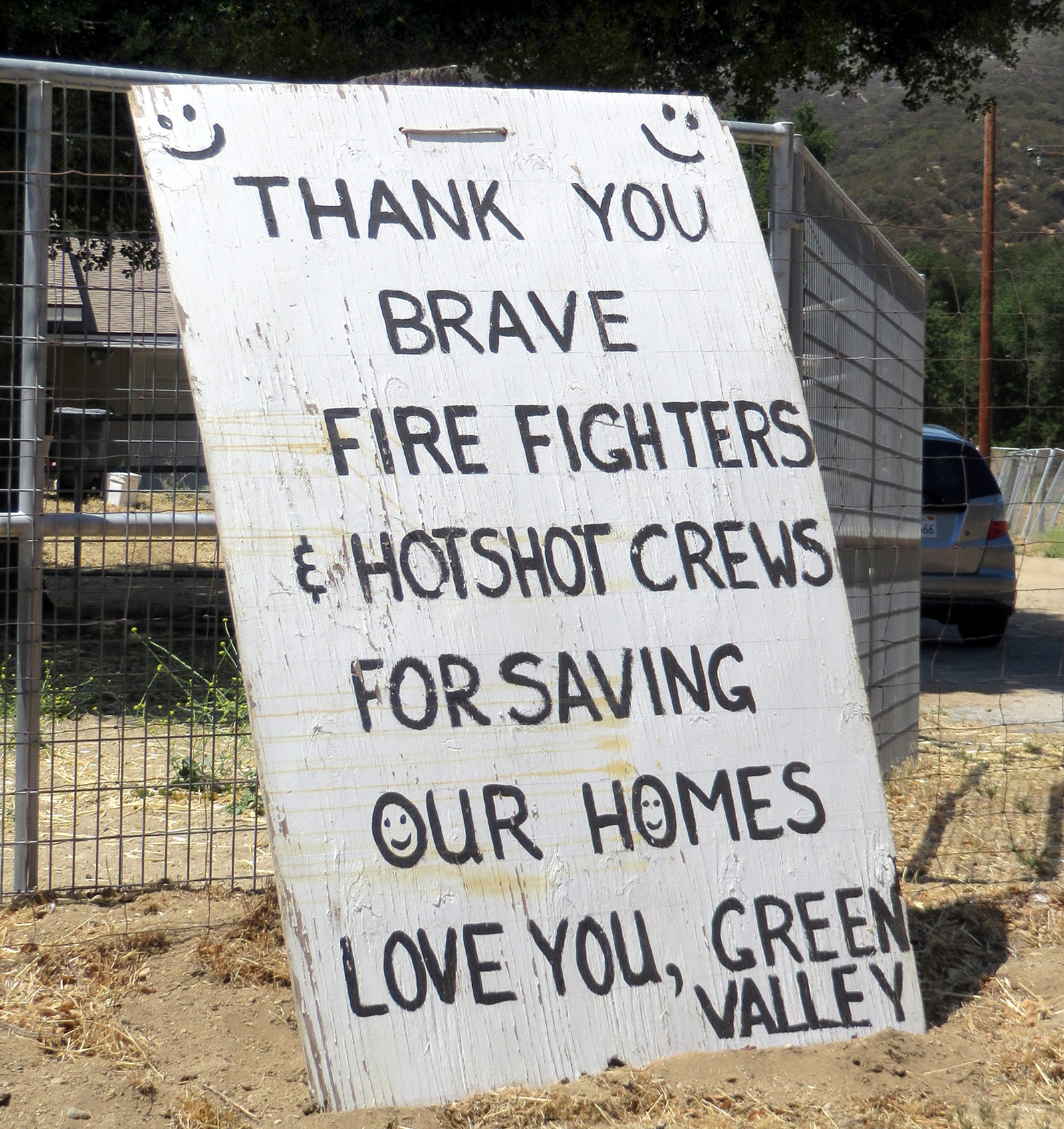 their appreciation, just as they had done when the South Fire of August 2008 posed an even greater threat to Green Valley homes. In fact, it's the same sign they used in 2008.
