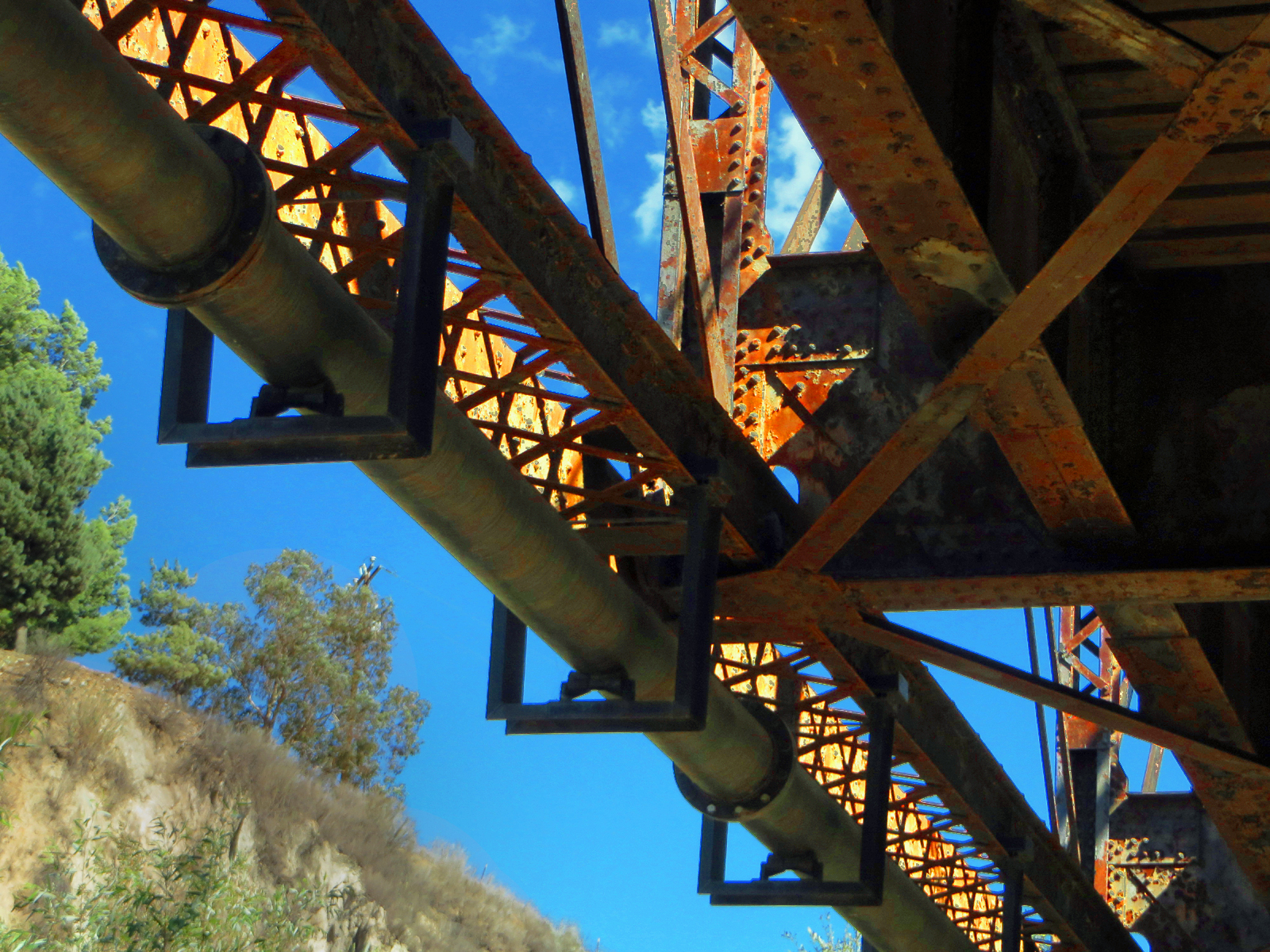 September 7, 2013 — The Southern Pacific Railroad bridge over Piru Creek is located on the east side of Piru behind Warring Park. The steel through-truss, two-span bridge was built in 1902 by J.P. Morgan's American Bridge Co. of New York. It's of the Pratt type, with diagonals sloping downward toward the center. Each span is 160 feet, for a total of 320 feet.