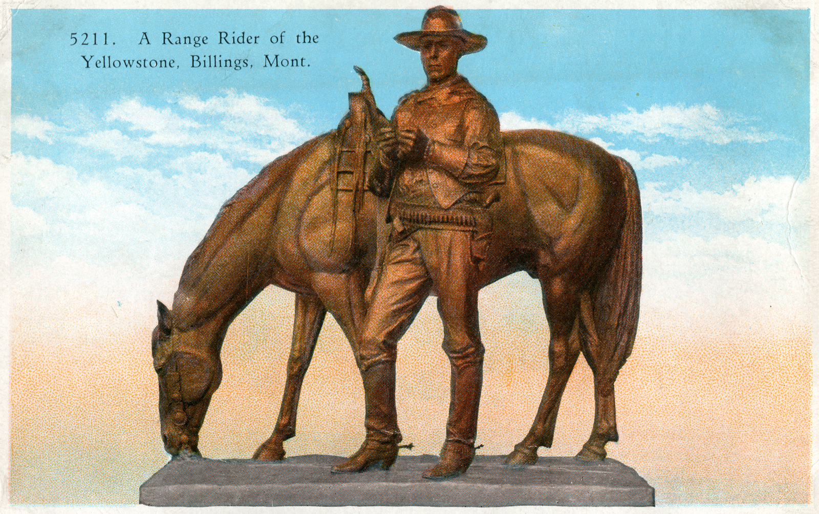 The Bronze Statue "A Range Rider of the Yellowstone" is located on the Rimrock at Billings, Mont. Total height 6 ft. 7½ inches. This statue was posed by William S. Hart and his horse, and is typical of an early day Range Rider.