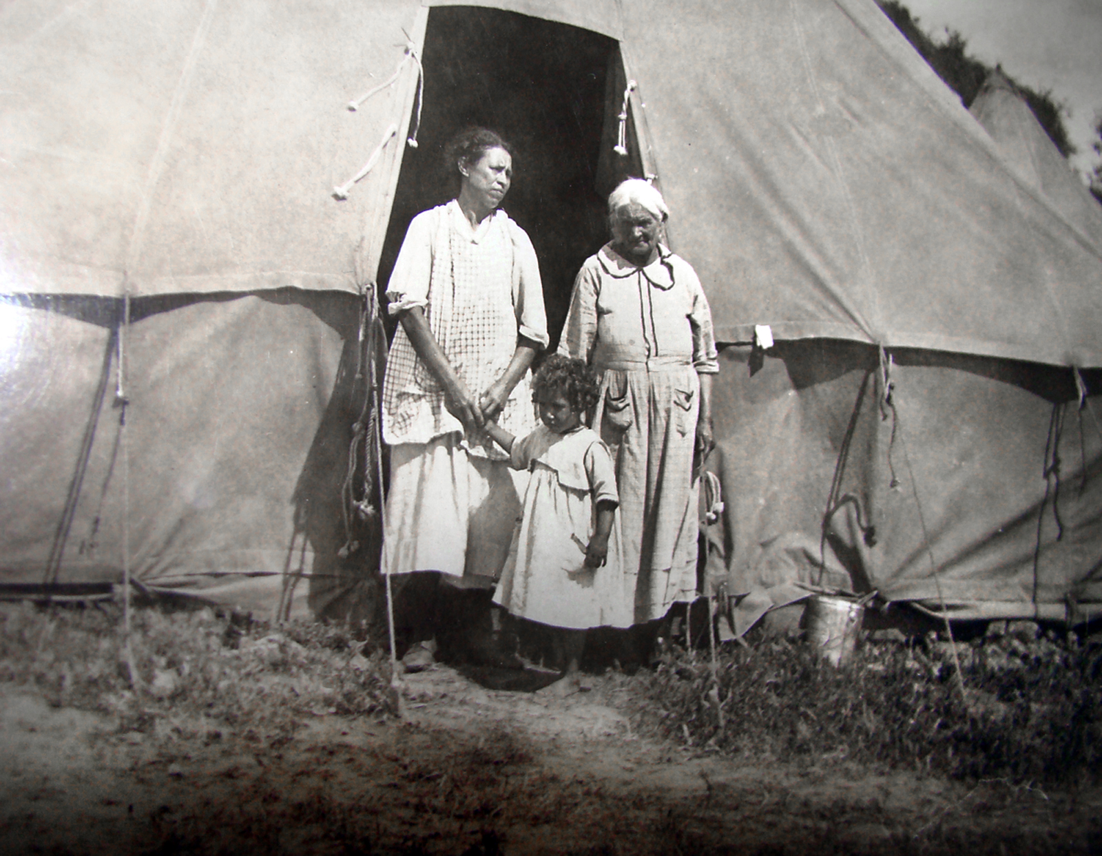 Three generations of an unidentified family pose for a photograph in front of a Red Cross shelter in Santa Paula following the St. Francis Dam Disaster of March 12-13, 1928.