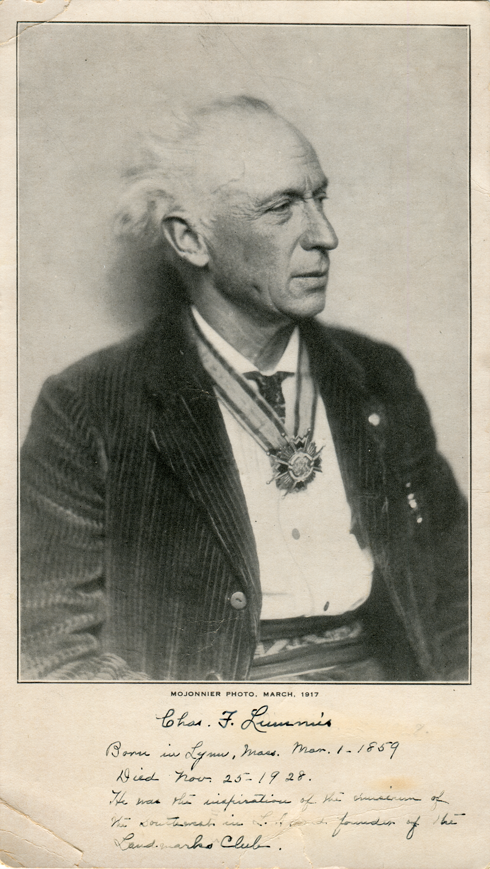 Charles Fletcher Lummis, March 1917, by Mojonnier. Card, 4.5x8 inches (photograph is 4x6", printed on card stock). Like a cabinet card, but not as thick (and newer and larger).