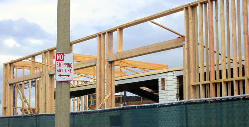 October 9, 2013 — New framing for Toppers Pizza Place Valencia wraps around the structural remnants of the former Bob's Big Boy Restaurant building at 23701 W. Valencia Blvd. (southeast corner of Valencia and Magic Mountain Parkway).