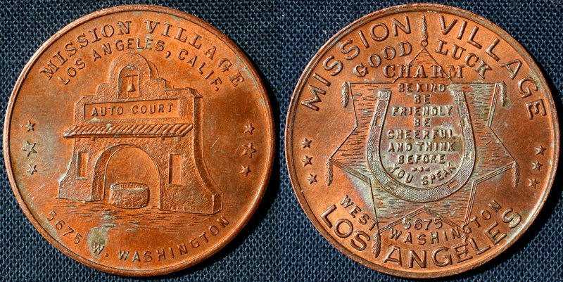 Foreshadowing the tokens from his Old West Trading Post in Saugus, Callahan issued these tokens in the late 1950s or early 1960s as mementoes of his Mission Village in Culver City.