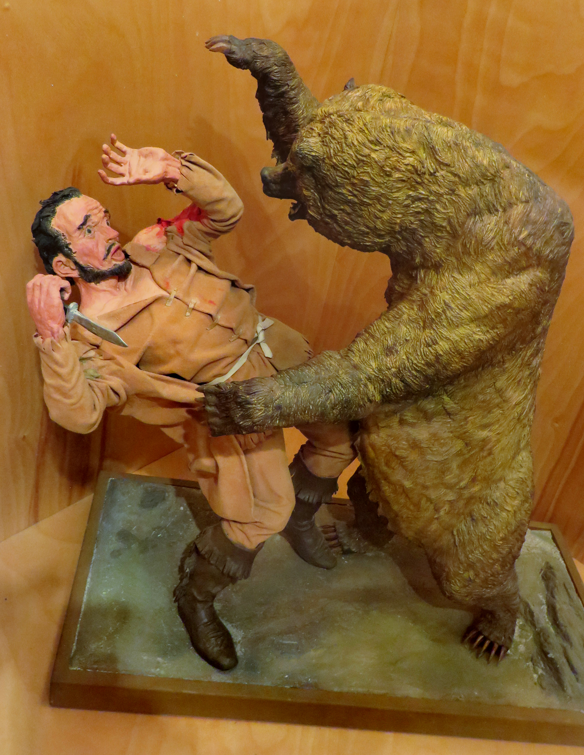 October 22, 2013 — Artist's interpretation of the fatal mauling of Peter Lebeck by a grizzly bear in 1837. Approx. 2-foot-tall statue in the Visitors Center at Fort Tejon State Historic Park.