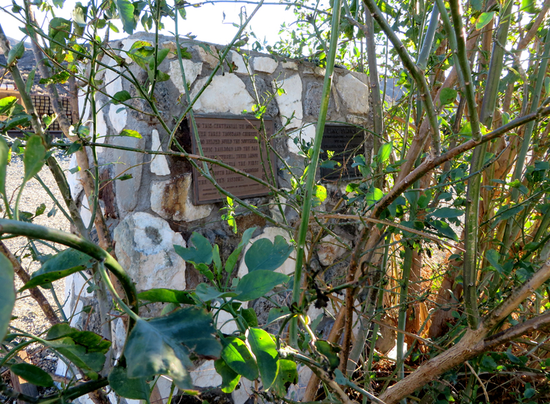 December 22, 2013 — Sorry state of affairs: Overgrown vegetation and debris obstruct the monument and historic plaques placed at the Lang Station site in 1976 for the centennail of the rail linkage between Los Angeles and San Francisco.