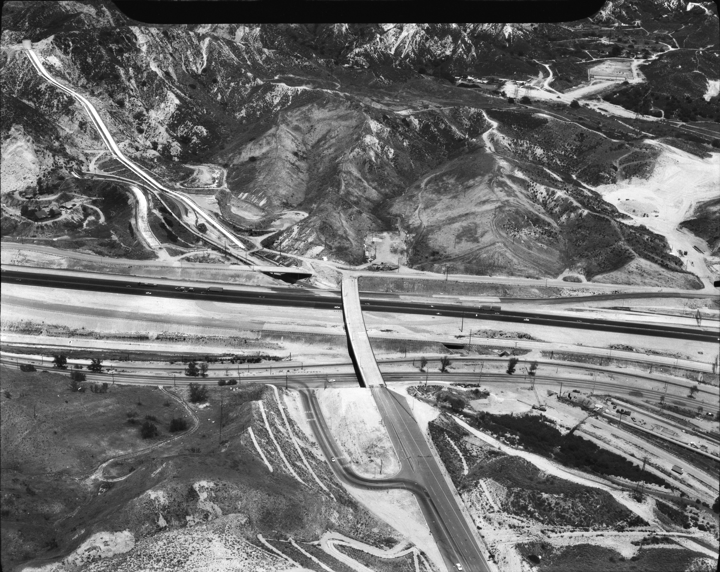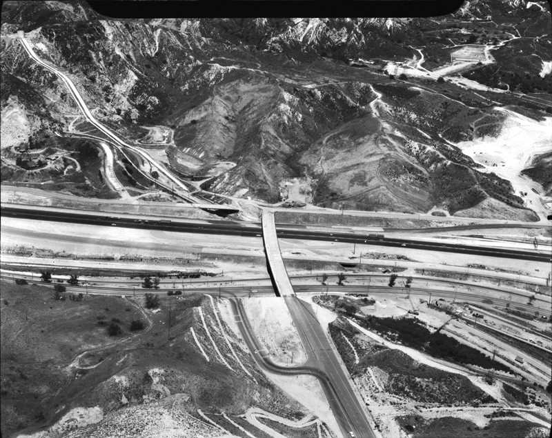 Interstate 5 at Balboa Boulevard looking east. Balboa runs up the middle. Foothill Boulevard has collapsed just north (left) of its intersection with