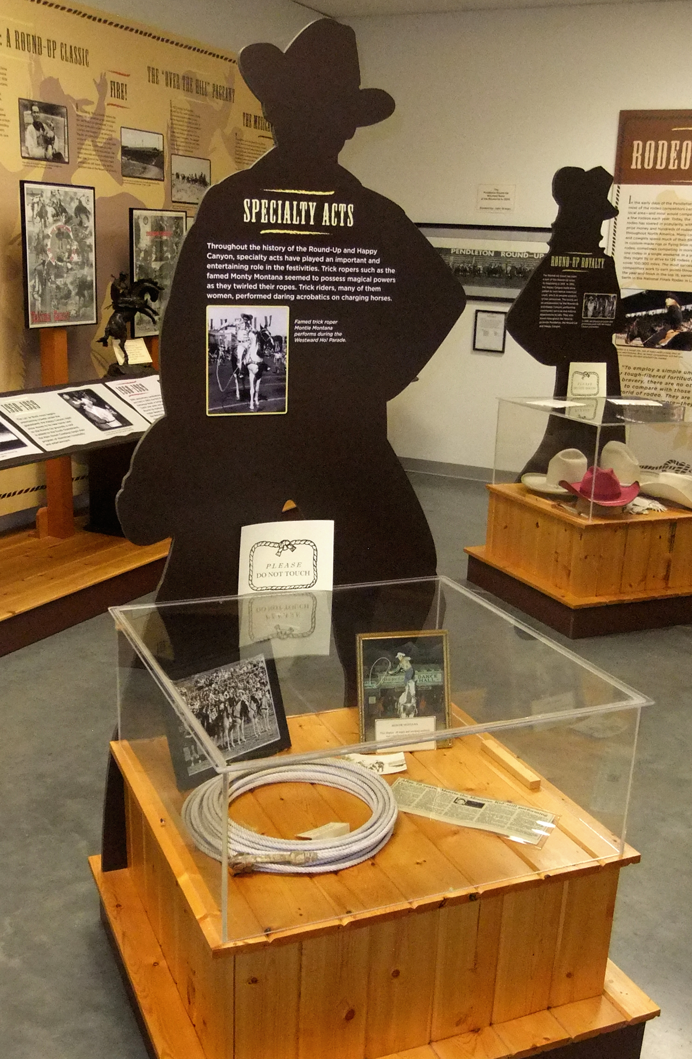 Specialty Acts. Throughout the history of the Round-Up and Happy Canyon, specialty acts have played an important and entertaining role in the festivities. Trick ropers such as the famed Monty [sic] Montana seemed to possess magical powers as they twirled their ropes. Trick riders, many of them women, performed daring acrobatics on charging horses.