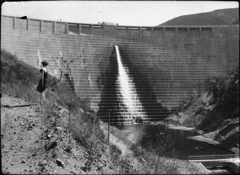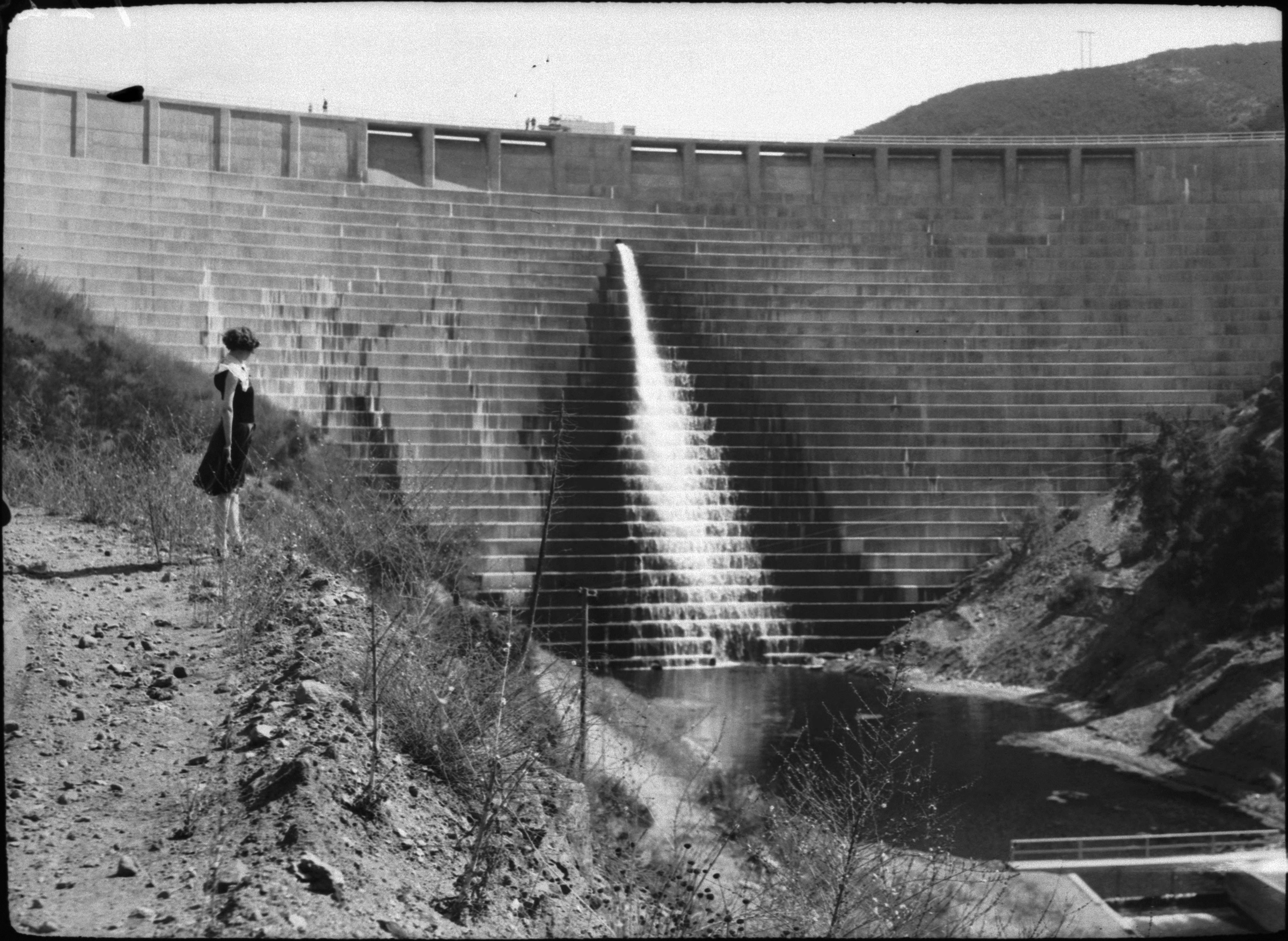 Unidentified woman peers into the St. Francis Dam's forebay, 1927.