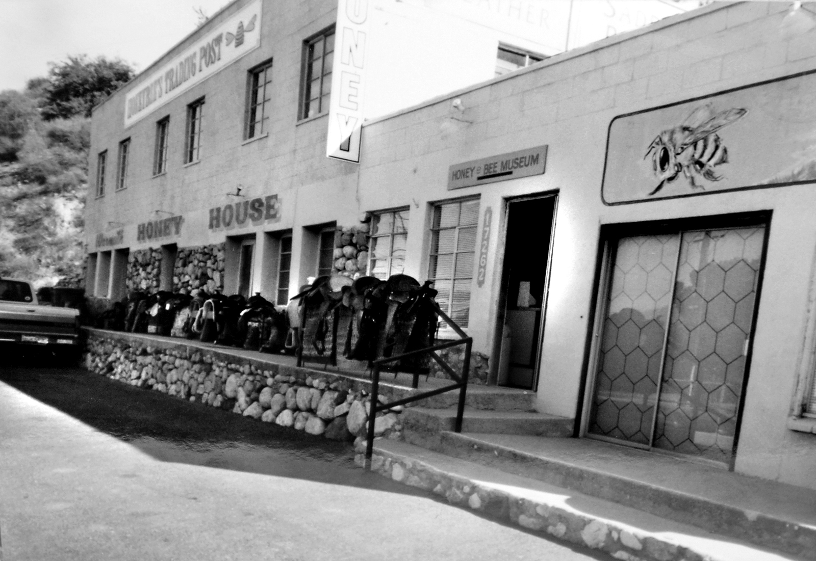 It was a popular stop for travelers on the Mint Canyon road. In 1986, Margaret Warmuth (1925-2006) converted the former sales office into a small "Honey & Bee Museum," and in its final years, the proprietors opened a custom leather shop in the building and made saddles.