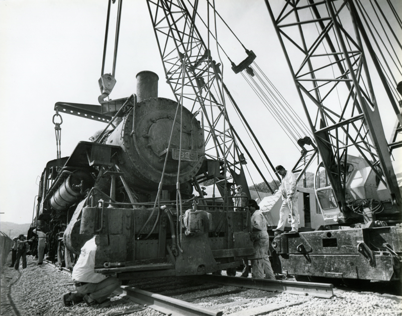 April 26, 1982 — Gene Autry's No. 1629 Mogul steam locomotive is lowered onto the tracks on the east side of the Southern Pacific Saugus depot at Heritage Junction Historic Park in Newhall.