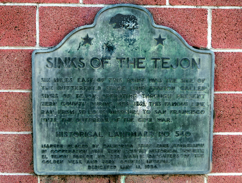 The Sinks of Tejon Station is California Historical Landmark No. 540. The marker is located at the southwest corner of David Road and Wheeler Ridge Road, 6 miles west of the actual site of the station, which no longer exists.